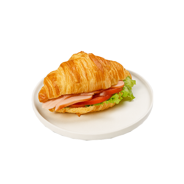 Круассан слоеный , соус Барбекю, свинина ветчина, сыр Чеддер, салат Айсберг